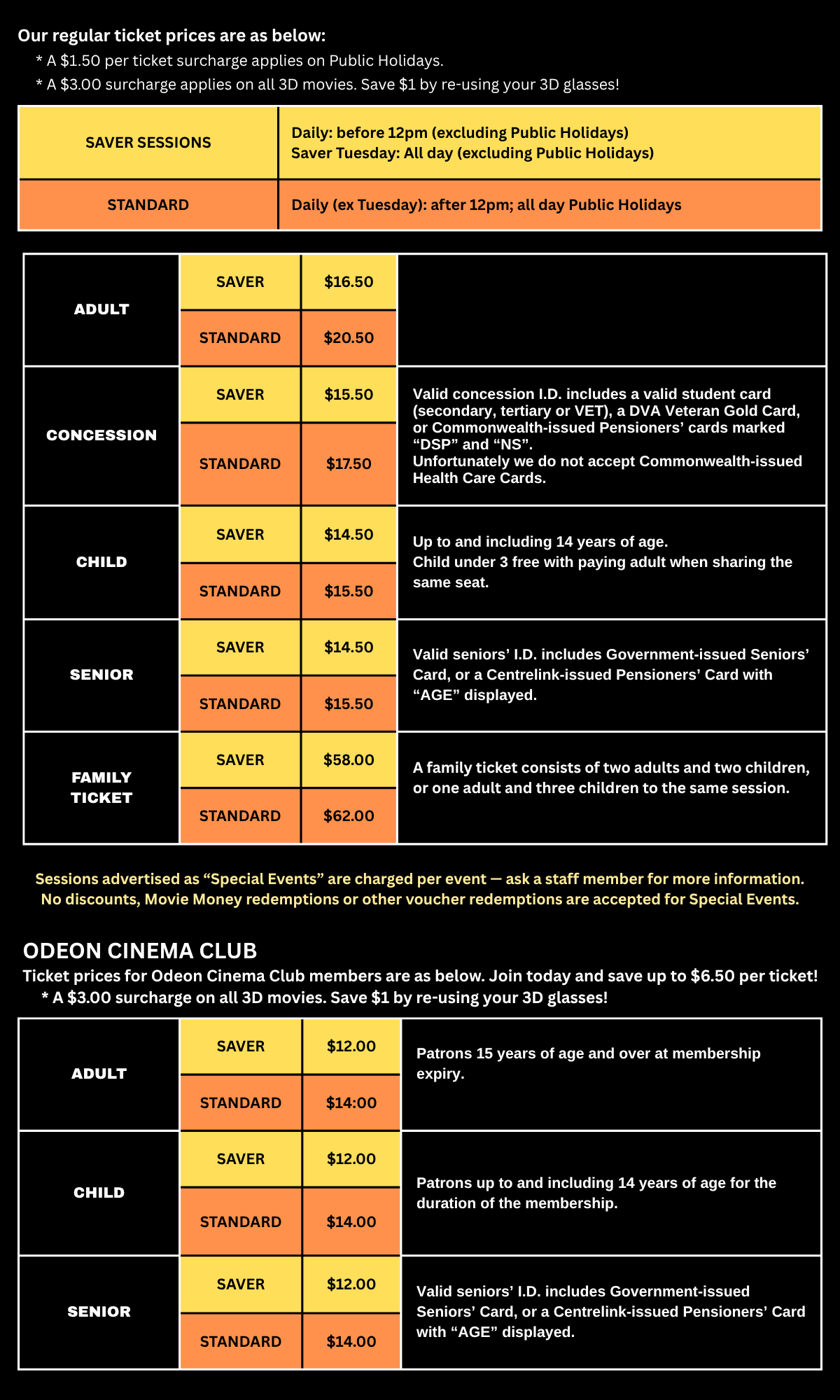 Concession members $11.00 for Saver sessions, $13.00 for Standard sessions.